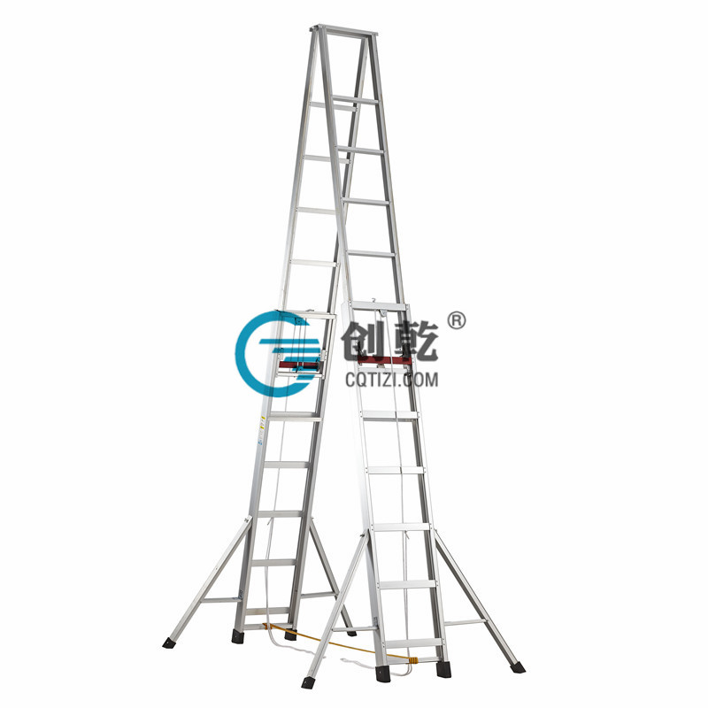 CQS-10M伸縮梯子8只腳知珠腳設計,保證梯子伸長最高時不會向任何方向傾斜,特別提示:當階梯高低不一時,人B須從低處往上上梯子,并且高處最好能有個人協助扶住梯子。其它場合使用,打開梯子后不需要任何人幫忙,一個人可放心作業。