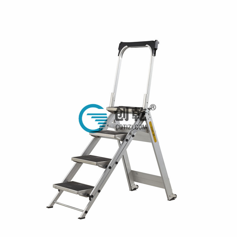 CQVF-2扶手踏臺采用航空鋁材加工制造而成。 2.踏板踩踏面積24*36(cm)有防滑紋,踩踏舒適。 3.外觀時尚,屬于高端家用梯。 4.梯腳后根有輪子,可用扶手拖著走。